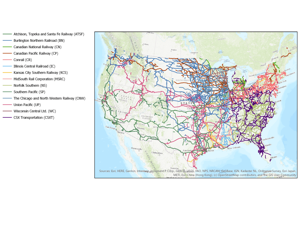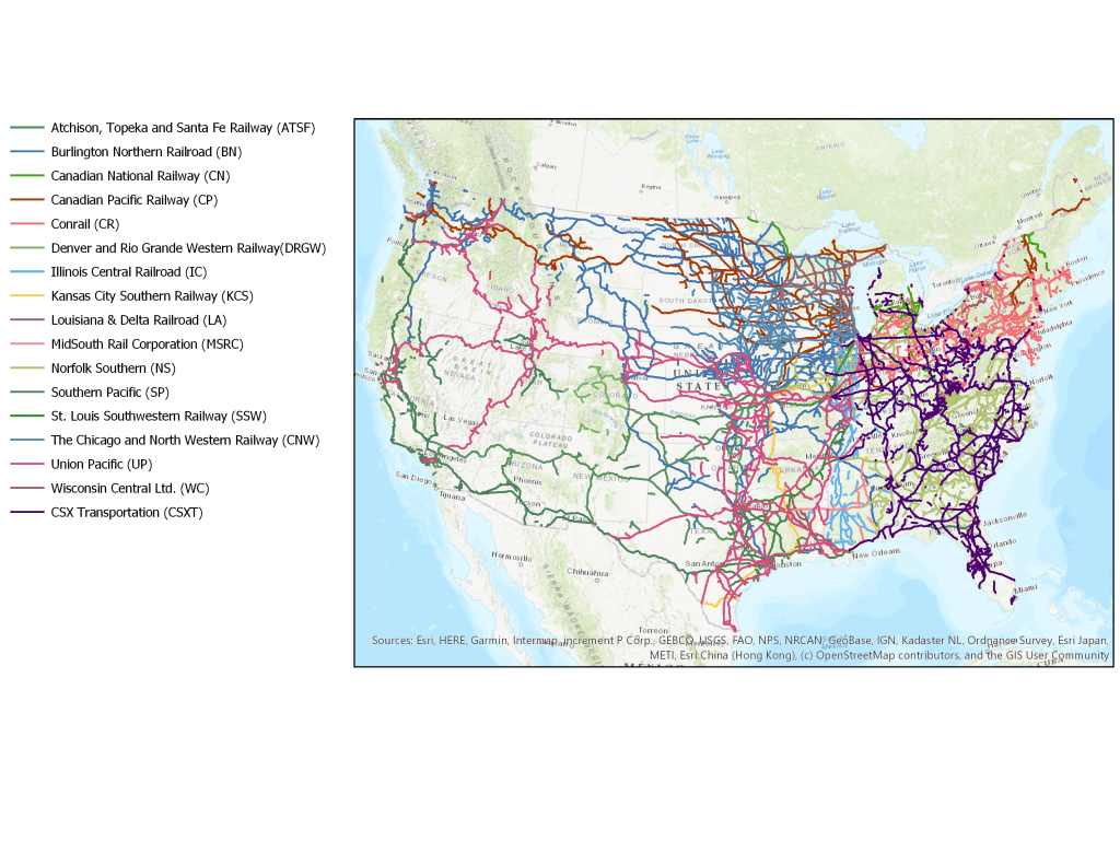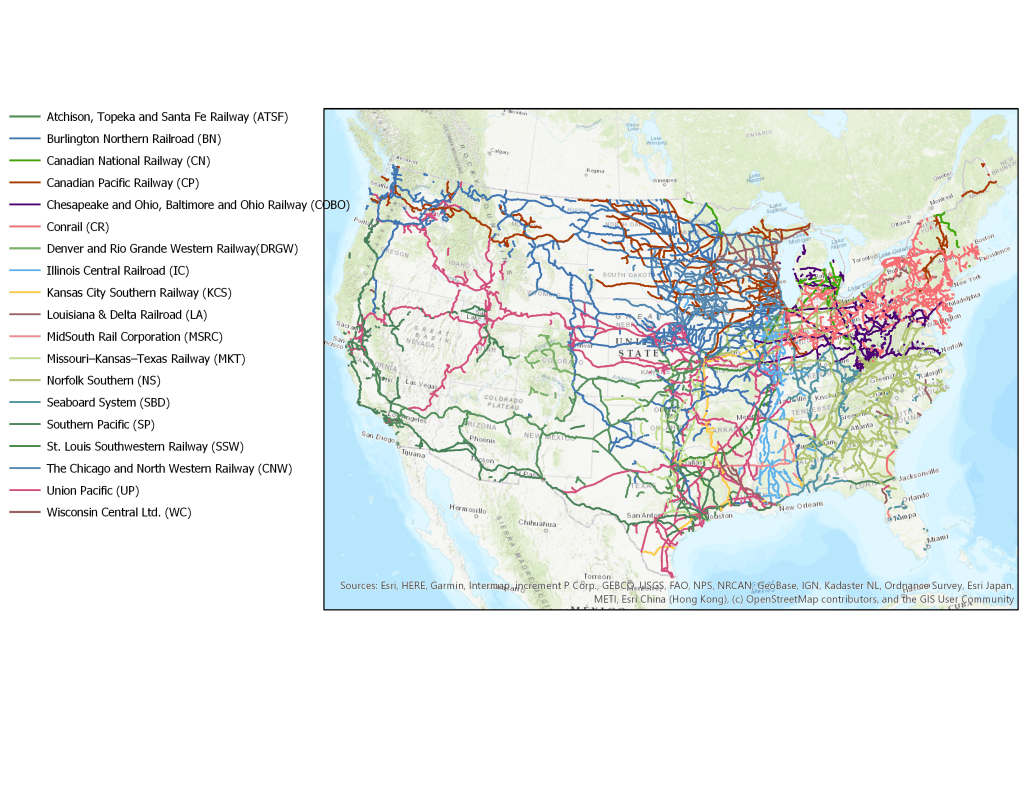 My research studies mergers of American railroads. Below I illustrate the geographic information of American railroads that I collected and the information of virtual networks that I constructed.