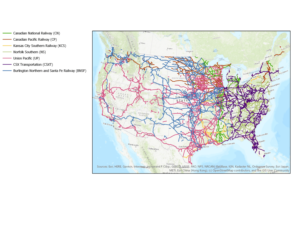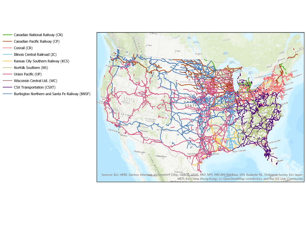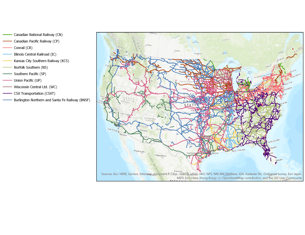 Figure below illustrates the network of the seven Class I railroads in 2004: the Burlington Northern and Santa Fe railway (BNSF) competes with the Union Pacific railway (UP) in the west, the CSX Transportation (CSXT) and the Norfolk Southern railway (NS) competes in the east. Two Canadian Class I railroads the Canadian Pacific railway (CP) and the Canadian National railway (CN) connect freight shipment between Canada and U.S., and the Kansas City Southern railway (KCS) locates in the south and connects freight shipment between Mexico and the United States.